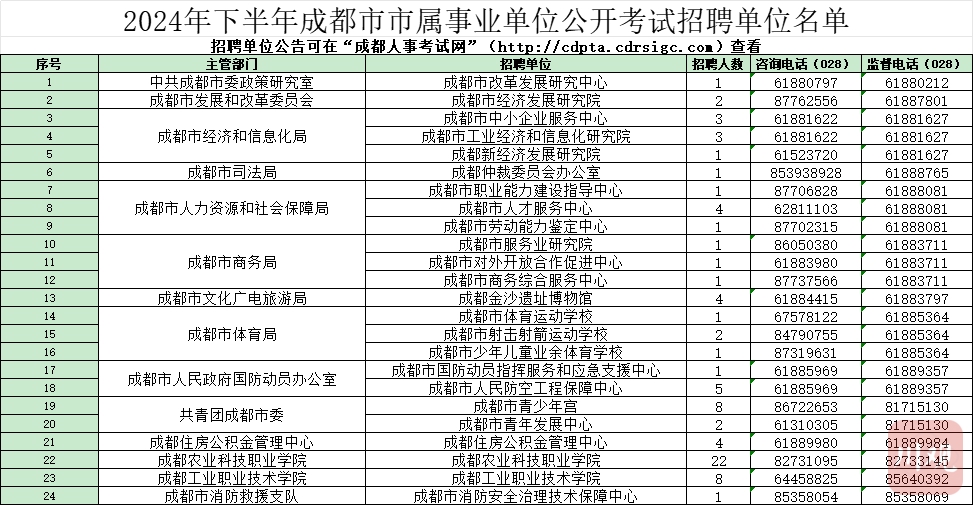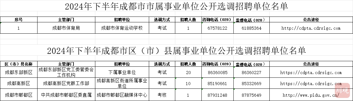 根据四川省和成都市事业单位公开招聘工作人员相关规定,成都市16家市级部门所属事业单位和四川天府新区等21个区(市)县所属事业单位拟公开招聘(含考试、考核、选调招聘)工作人员1292名。本次公开招聘进入事业单位的为编制内正式工作人员,按国家《事业单位人事管理条例》及相关规定实行事业单位聘用制管理,欢迎广大优秀人才报名应聘。 招聘单位情况 成都市16家市级部门所属事业单位(以下简称市属事业单位)公开招聘95名工作人员,四川天府新区、成都东部新区、成都高新区、青羊区、金牛区、成华区、龙泉驿区、青白江区、新都区、温江区、双流区、郫都区、新津区、简阳市、都江堰市、彭州市、邛崃市、崇州市、金堂县、大邑县、蒲江县21个区(市)县所属事业单位(以下简称区(市)县属事业单位)公开招聘1197名工作人员。详细情况见《2024年下半年成都市事业单位公开招聘单位名单》。 《2024年下半年成都市事业单位公开招聘单位名单》